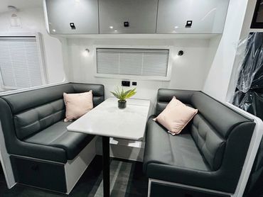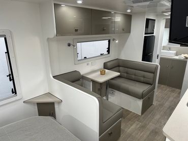 When it’s time to relax, the booth-style seating offers a comfortable and inviting space for meals, work, or winding down at the end of the day. The queen-size bed promises a restful night’s sleep, ensuring you're refreshed and ready for the next adventure.