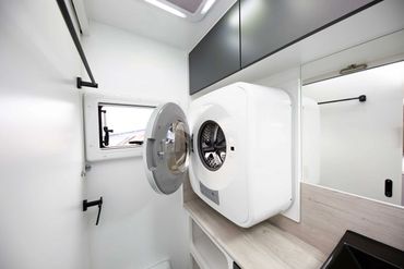 The fully-equipped kitchen features quality appliances and practical storage, making it easy to prepare meals no matter where you’re parked. A built-in washing machine adds another layer of freedom, letting you keep clothes fresh without seeking out laundromats.